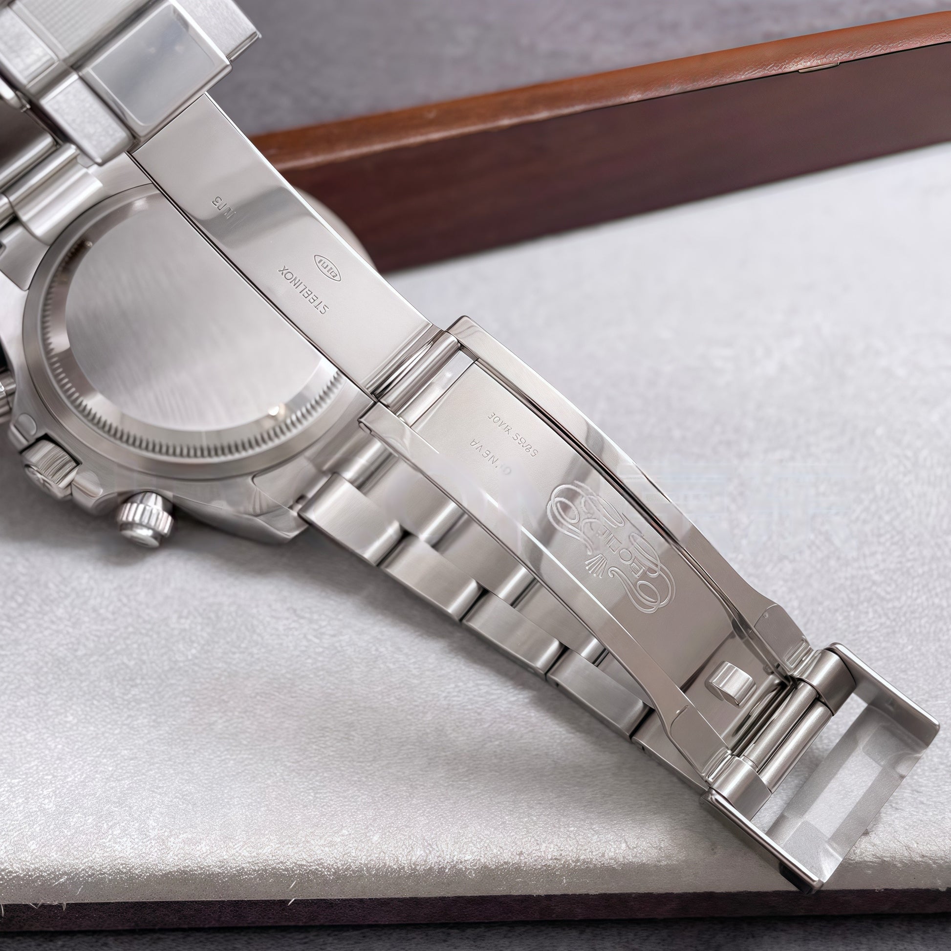 Oystersteel Brilliance: Crafted from Rolex’s proprietary 904L stainless steel (Oystersteel), the 40mm case and Oyster bracelet are polished to a mirror finish, offering exceptional corrosion resistance and a lustrous sheen that withstands daily wear912.